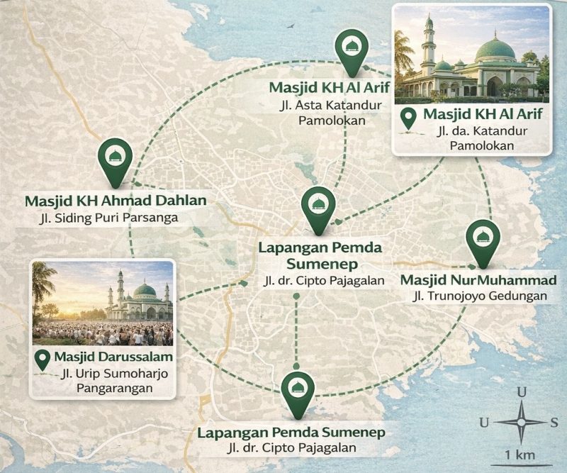 Adapun enam titik yang disiapkan yakni Lapangan Pemda Sumenep di Jalan dr. Cipto Pajagalan, halaman Masjid Darussalam di Jalan Urip Sumoharjo Pangarangan, halaman Masjid Nur Muhammad di Jalan Trunojoyo Gedungan, halaman Masjid Mujahidin di Jalan Pepaya Karangduak, halaman Masjid KH Ahmad Dahlan di Jalan Siding Puri Parsanga, serta halaman Masjid KH Al Arif di Jalan Asta Katandur Pamolokan.