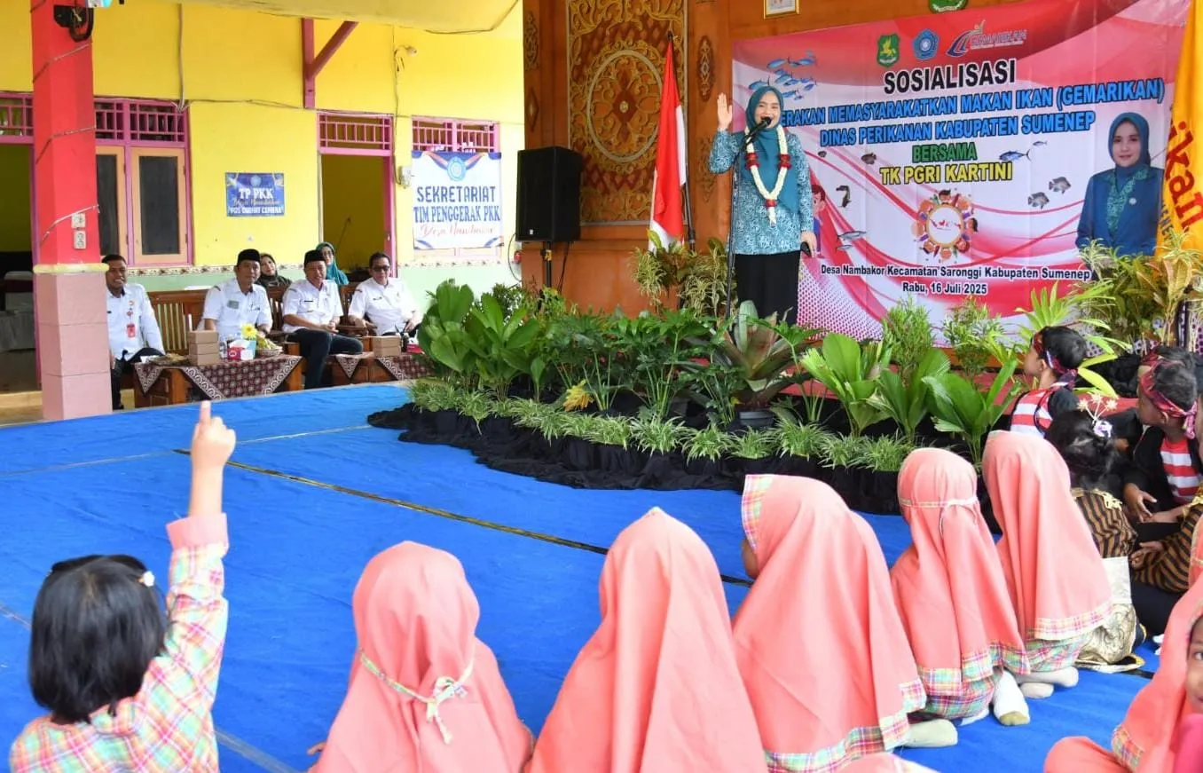 Sumenep — Ketua Tim Penggerak PKK Kabupaten Sumenep, Nia Kurnia Fauzi, mengajak masyarakat untuk membudayakan konsumsi ikan laut sebagai bagian dari pola makan sehat keluarga. Ajakan ini disampaikan saat kegiatan Sosialisasi Gerakan Memasyarakatkan Makan Ikan (Gemarikan) di TK PGRI Desa Nambakor, Kecamatan Saronggi, Rabu (16/07/2025).